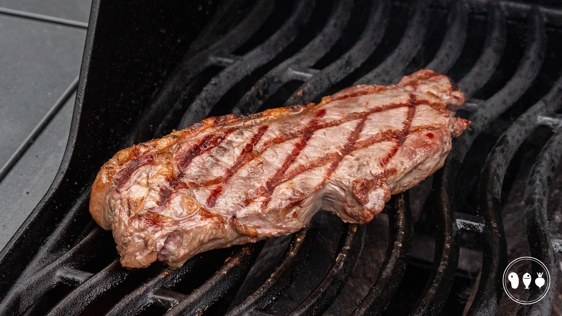 Wij hebben de entrecote eerst 2 minuten laten liggen. Daarna komt de steak ook makkelijk los van het rooster. De andere kant grillen we ook twee minuten en daarna draaien we telkens na 1 minuut de steak. Als je de steak draait, draai hem dan ook een kwartslag zodat er een ruit van grillmarks ontstaat.
