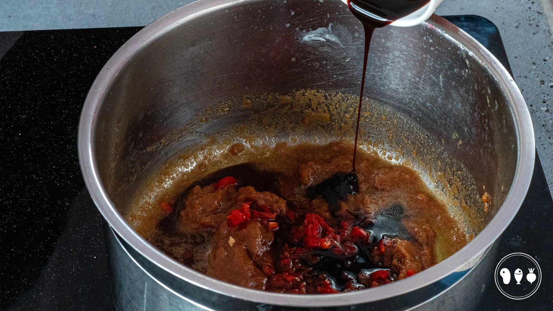 Proef tussendoor de jus. Doordat je bouillon, soja en ketjap gebruikt kan de jus erg zout worden. Voeg dan eventueel wat suiker toe. Wanneer de jus goed is, giet je deze in een mooie schenk kan en zet je apart. Houd de jus wel een beetje warm.