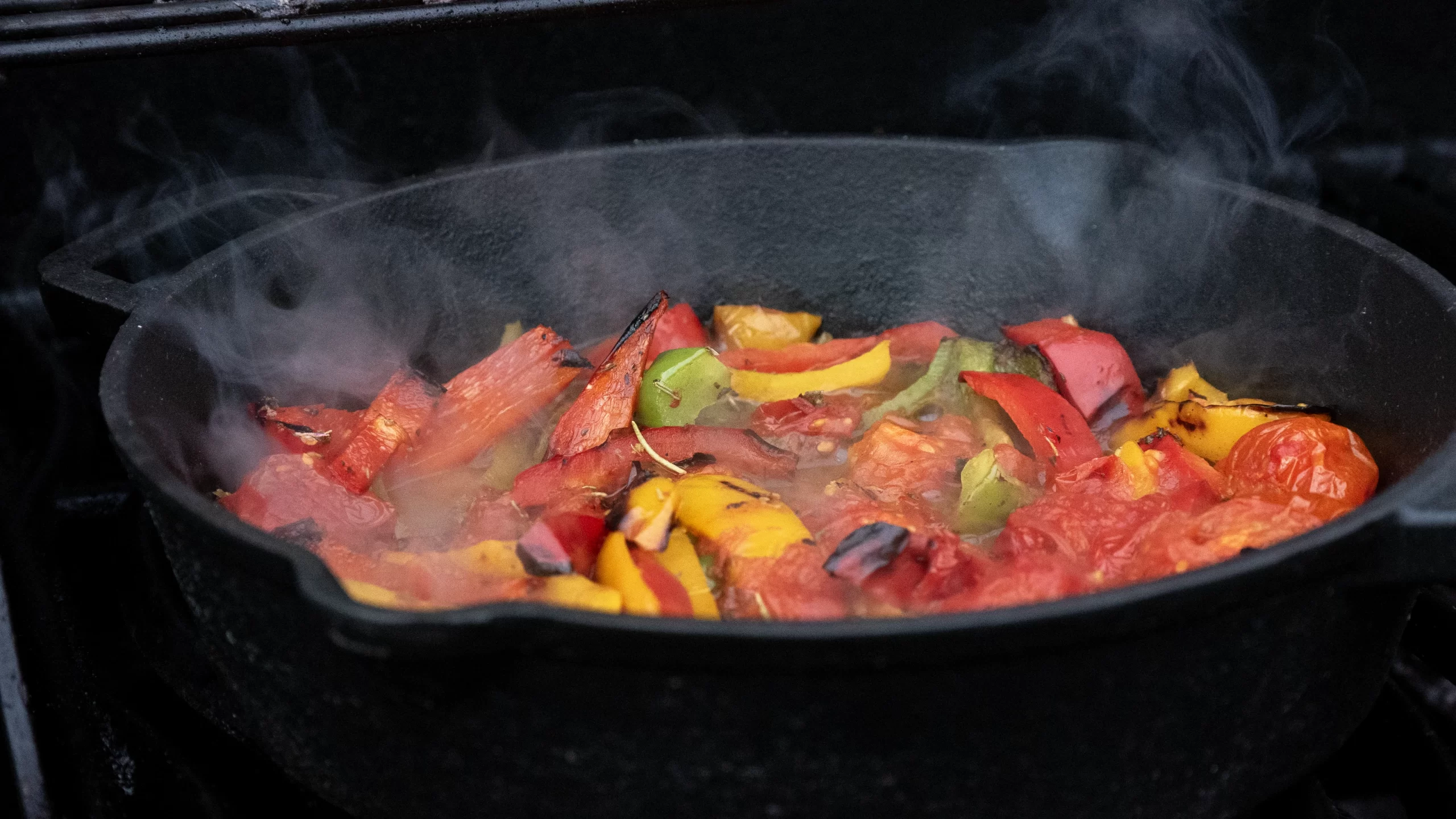 Voor deze BBQ versie van de peperonata heb ik het recept versimpeld. Simpelweg omdat het ontvellen van de paprika en tomaat  best wat handelingen en tijd vergt. Iets dat voor een bijgerecht niet altijd voorhanden is. Het ontvellen laten we dus achterwegen maar weeg gerust, dit vega bijgerecht blijft een topper. Voor de typische BBQ smaak gaan we de paprika's, ui en cherrytomaatjes kort grillen en daarna laten we het geheel nog langzaam op smaak komen in witte wijn en bouillon. Dit resulteert in zachte groentes met een beetje bite. Perfect om te serveren bij een gegrilde rib eye of entrecote maar ook super lekker om op een BBQburger of Hot Dog.