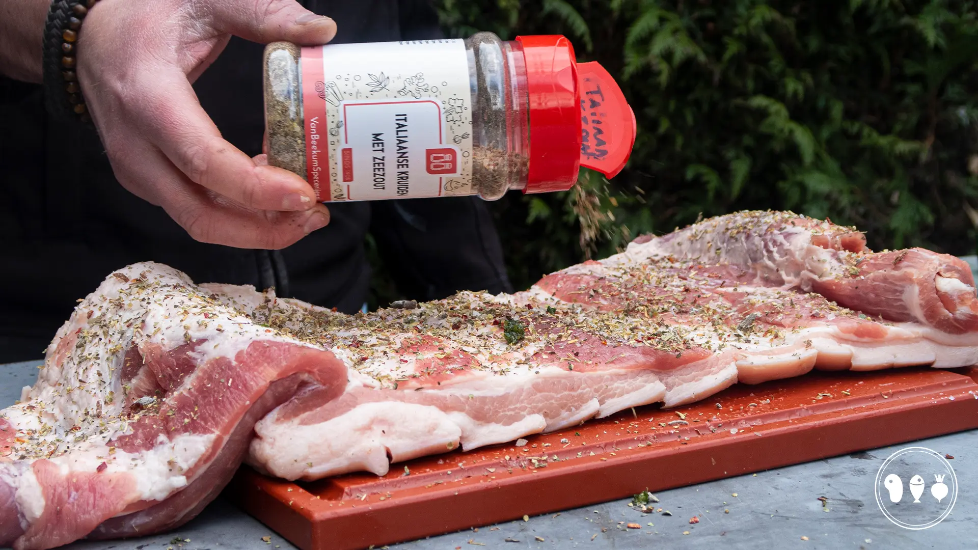 Wat wij wel gelijk hebben gehouden aan de originele bereiding is het gebruik van het spit. Door het spit wordt de porchetta overal evenredig gegaard. Dit versnelt de bereidingstijd maar zorgt dus ook dat de zwoerd echt op alle plekken lekker crispy wordt, en dat is natuurlijk precies wat je wilt. Heb je nou geen spit, geen probleem, je bent alleen iets drukker omdat je de rollade telkens moet draaien om hetzelfde knapperige resultaat te krijgen. De porchetta is dus een Italiaanse varkensrollade. Hij staat bekend om de mooie tekening van de verse kruiden in de binnenkant van het vlees. Dit krijg je door de buikspek te vlinderen. Daarmee maak je het vlees overal even dik en heb je op alle plekken evenveel kruiden. Hetzelfde hebben wij al eerder laten zien bij onze andere rollade's: zalmrollade en bavette rollade.