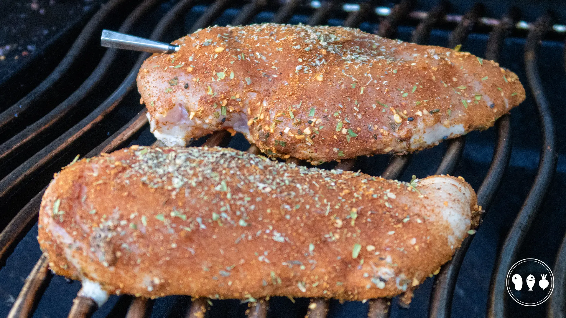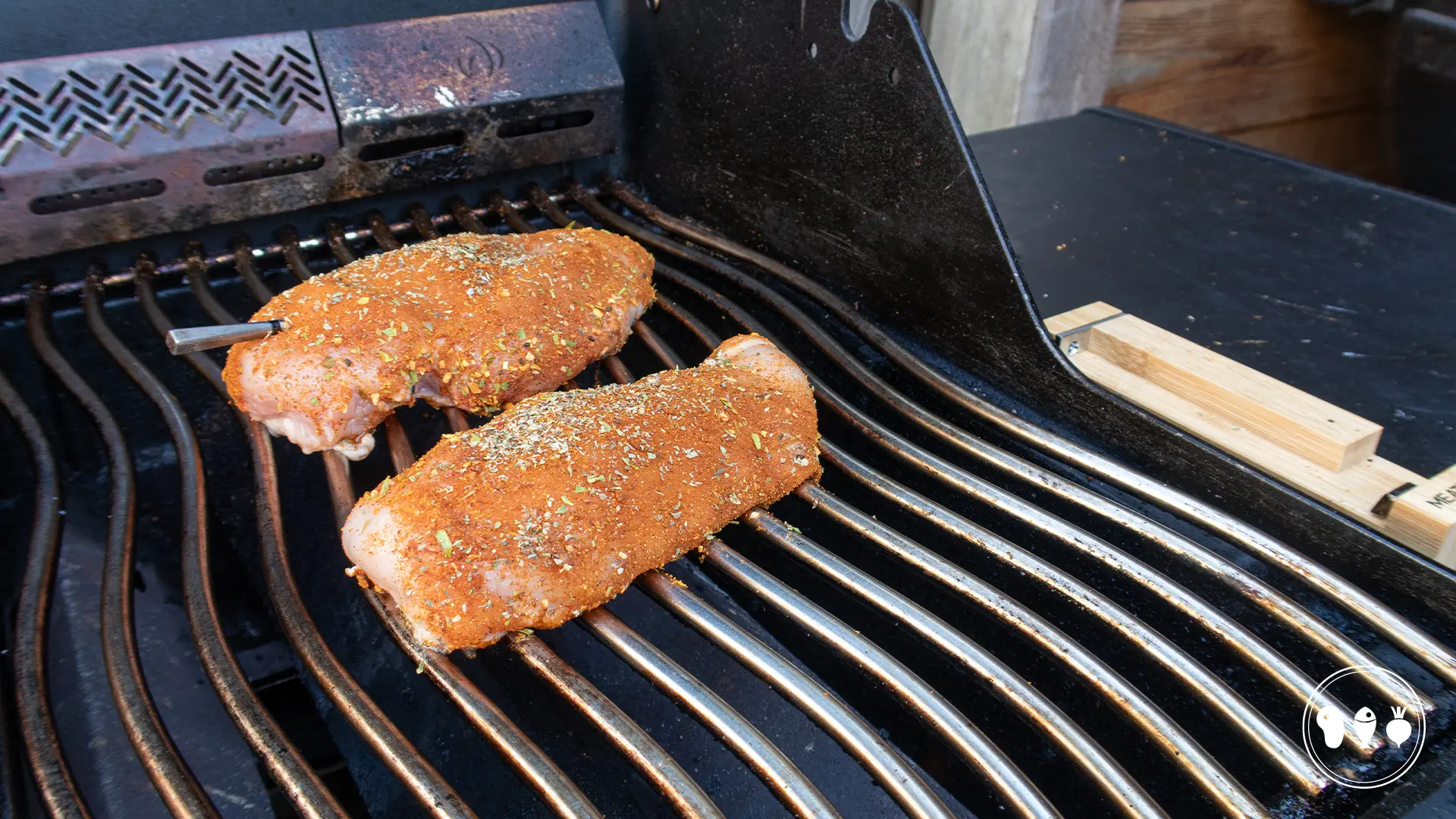 Gril de gekruide kipfilets op de indirecte kant van de BBQ tot deze een kerntemperatuur hebben van 72°C. Laat even rusten voor ongeveer 5 minuten.