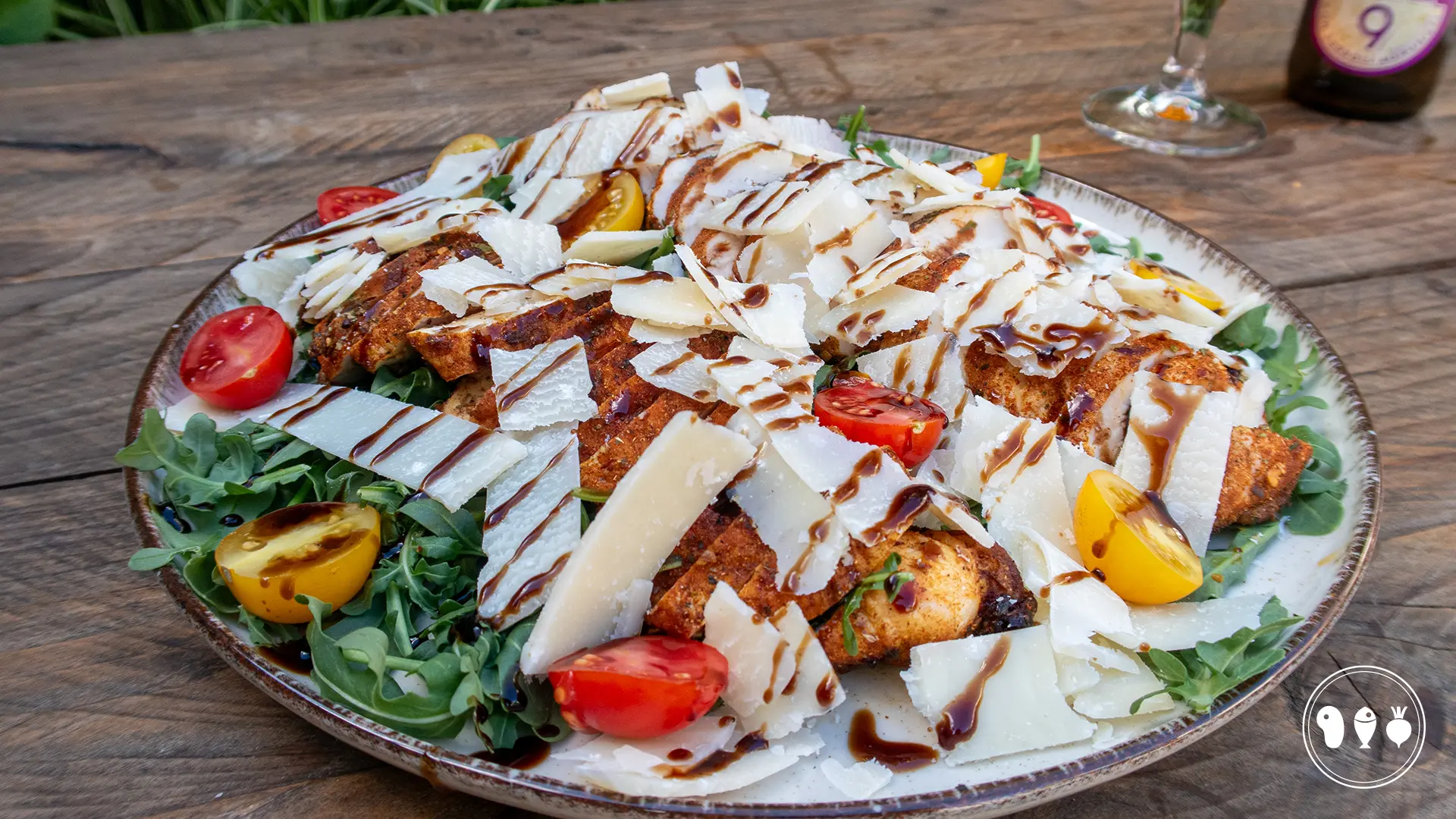 Onze Tagliata di pollo van de BBQ wordt geserveerd op een bedje van rucola, met cherry tomaatjes, Parmezaanse kaas en flinke scheut balsamico dressing of siroop. Het resultaat is een kleurrijk, smaakvol gerecht dat zowel als hoofdgerecht als lichte lunch perfect tot zijn recht komt.