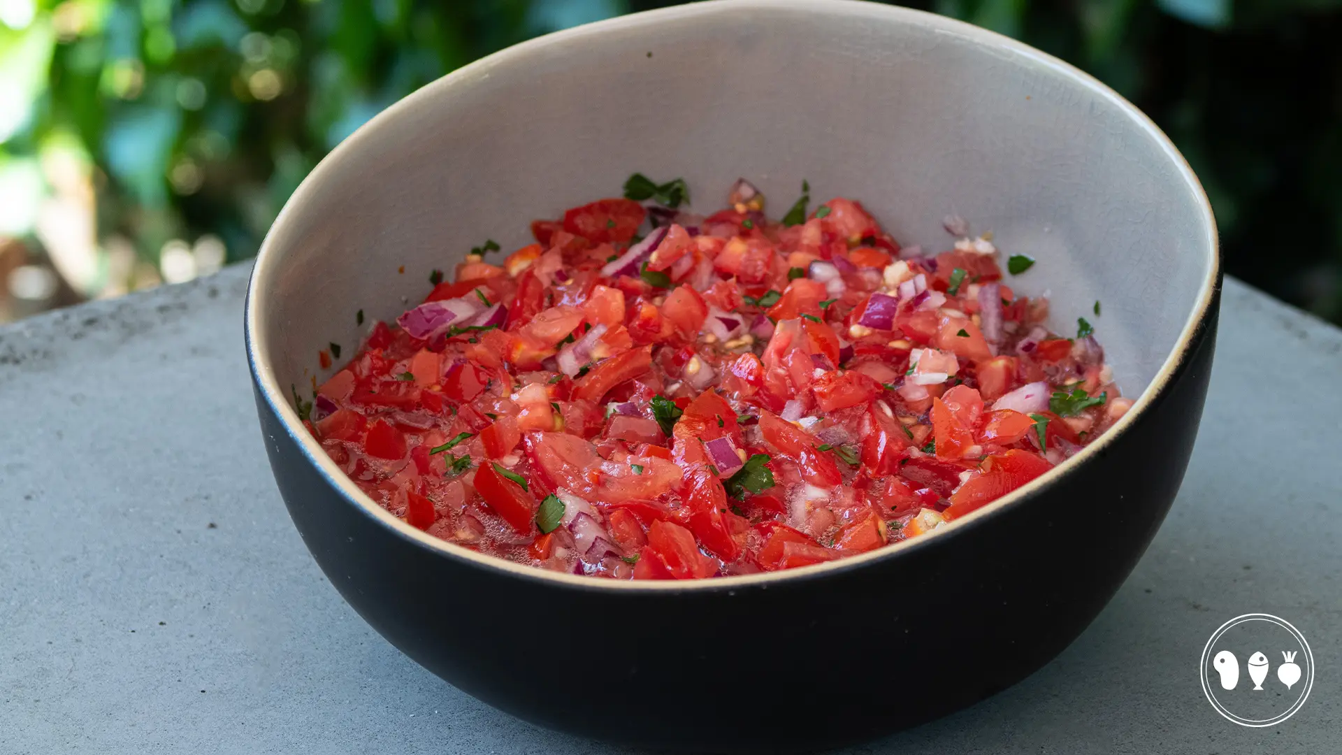 Een verse tomatensalsa is wat mij betreft een must have in je recepten repertoire. Een tomatensalsa is namelijk super veelzijdig. Je kan het serveren als fris bijgerecht maar je kan het ook gebruiken op een hotdog, burger of loaded nacho's. Een recept om uit je hoofd te leren dus. Deze verse tomatensalsa heeft niet veel nodig. Met een handvol ingredienten maak je deze smaakvolle salsa. Naast de tomaten, gaat er nog rode ui, knoflook, peterselie en limoen in de salsa. Ingrediënten die ik altijd wel in huis heb. Daarom kan ik deze salsa altijd snel bij maken als ik een frisse touch aan een recept wilt geven. Uiteraard kan je nog veel meer kanten op. Voeg bijvoorbeeld verse bieslook toe of jalapeno's voor een beetje pit. Of voeg gegrilde paprika toe zoals we gedaan hebben in onze gegrilde tomatensalsa.