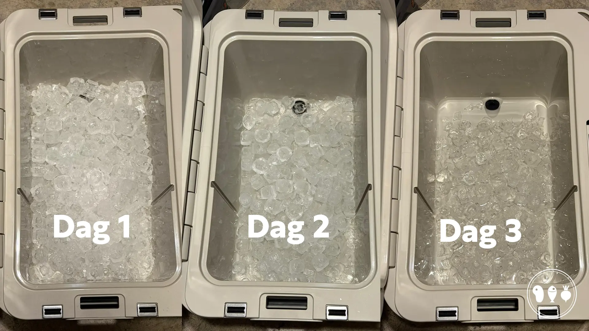 Om de isolatie te testen hebben we de 45QT pro gevuld met 4 kg. ijsblokjes. Coleman claimt namelijk dat deze 72 uur goed blijven. De test hebben we uitgevoerd in een week dat de buitentemperatuur rond de 12 graden lag. De koelbox hebben we in de schuur op de grond gezet en gevuld met kant en klare ijsblokjes uit de supermarkt. Op de foto kan je goed zien hoe dit is afgelopen. Na 72 uur was ongeveer de helft van de ijsblokjes gesmolten maar er zat dus nog zeker voldoende in. Er indrukwekkend!